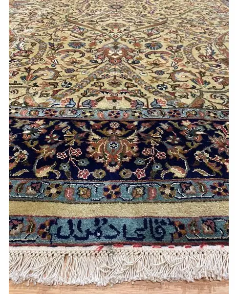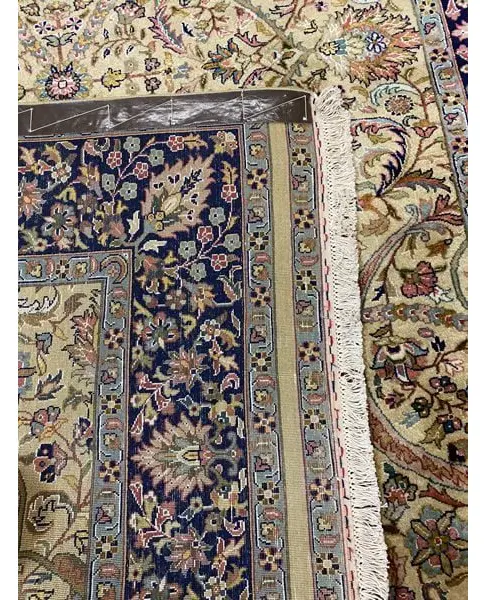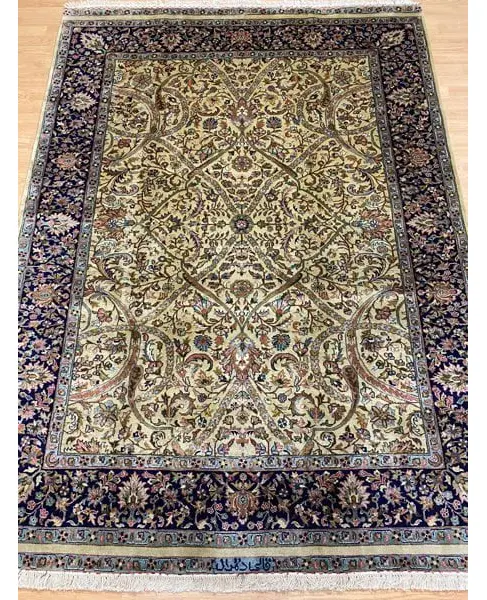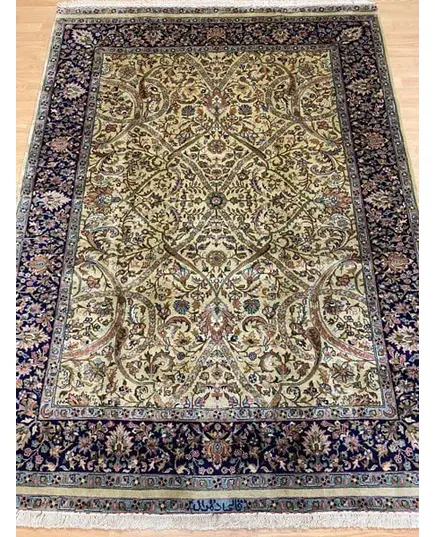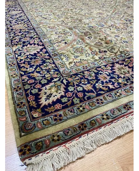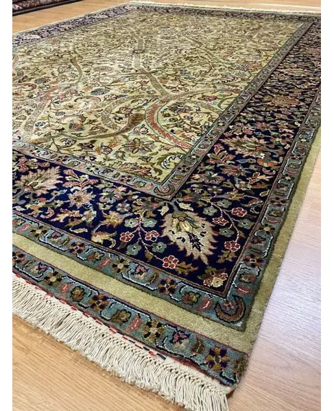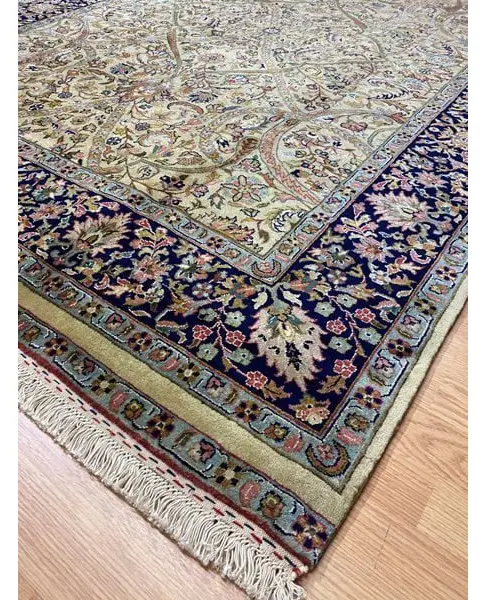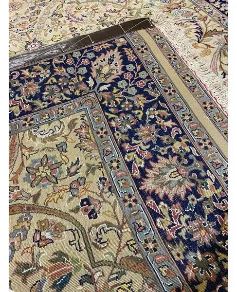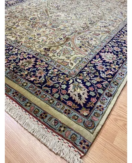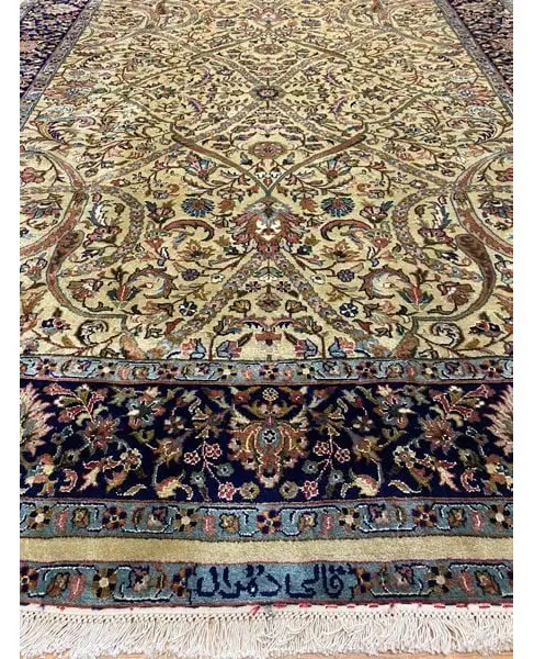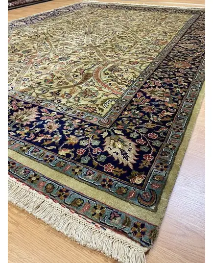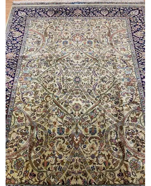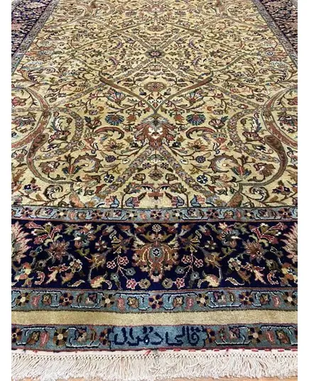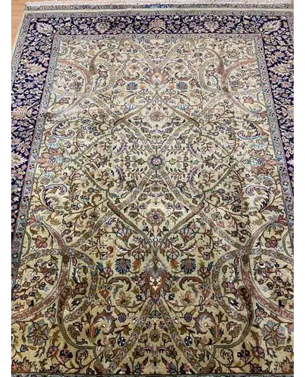 Από τις καλύτερες πυκνότητες της ινδικής ταπητουργίας. Μαλλινομέταξο διπλόκομπο GHOM αριστούργημα, ειδικής παραγγελίας σε κατασκευή και σχέδια. Ευκολοσυνδύαστα χρώματα, με ή χωρίς κέντρο, επαναλαμβανόμενα μοτίβα δείχνουν την συνέχεια στον χρόνο και στην ζωή που δεν σταματά. Χρώματα μπλέ βαθύ, πράσινο, κόκκινο, σάπιο μήλο, μπέζ, ώχρα, γαλάζιο, γκρί, καφέ.