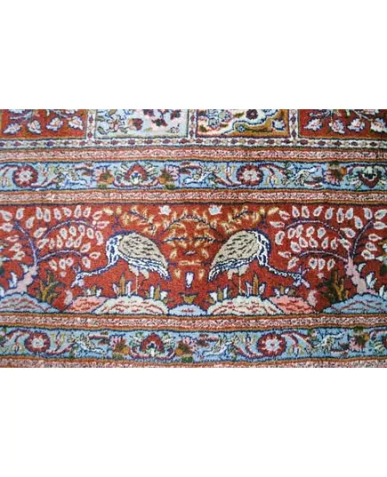 Ελάφια και πουλιά αγκαλιάζουν το κυρίως θέμα που είναι μικρά ασύμετρα χαλιά προσευχής με φυτικό διάκοσμο.