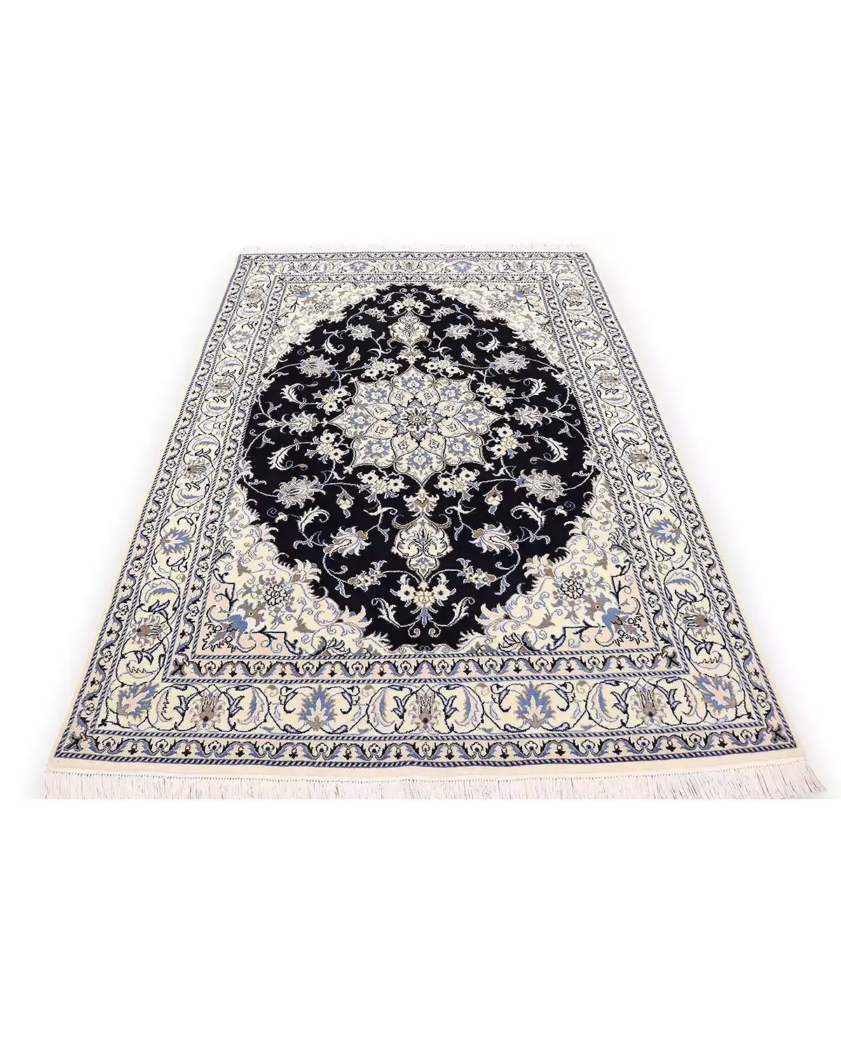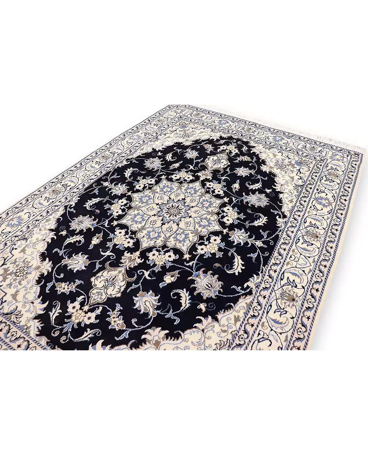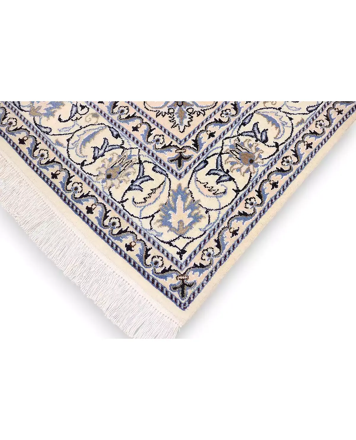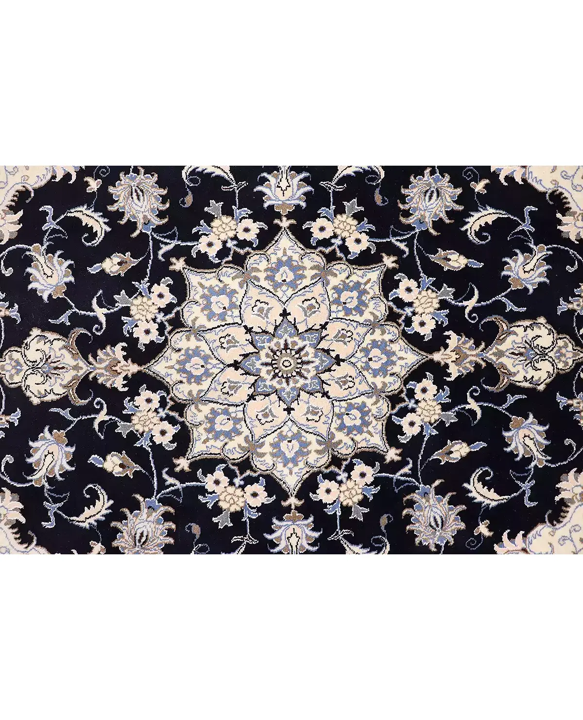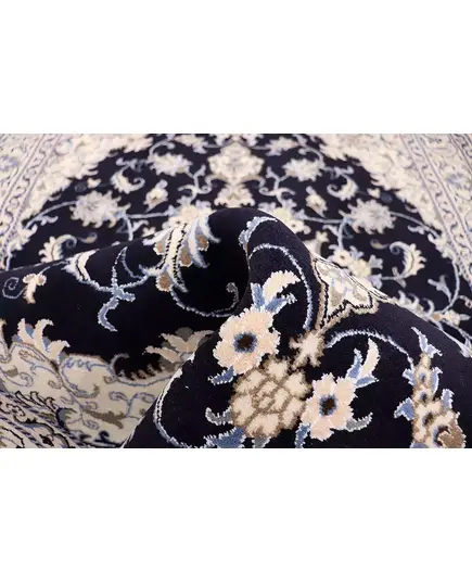 Χειροποίητο περσικό μαλλινομέταξο χαλί NAIN 9 LA. Από τα πιο γνωστά σχέδια της Περσίας υφαμένο στην ομώνυμη πόλη, ΝΑΙΝ. Τα περιγράμματα των σχεδίων του που αποτελούνται από μετάξι δίνουν μια διαφορετική υπόσταση στο χαλί με τη λάμψη τους. Χρησιμοποιούνται τα κλασσικά χρώματα αυτής της οικογένειας δηλαδή το μπλε, το μπεζ και το μπορντώ. Ποιότητα χαλιού αυστηρά ελεγμένη από τον εθνικό οργανισμό χαλιού Περσίας. Η ποιότητά του μοιάζει με 6LA και ESFAHAN από την πάνω του μεριά. Πυκνότητα, 400.000 κόμβους ανά τετρ. μέτρο.